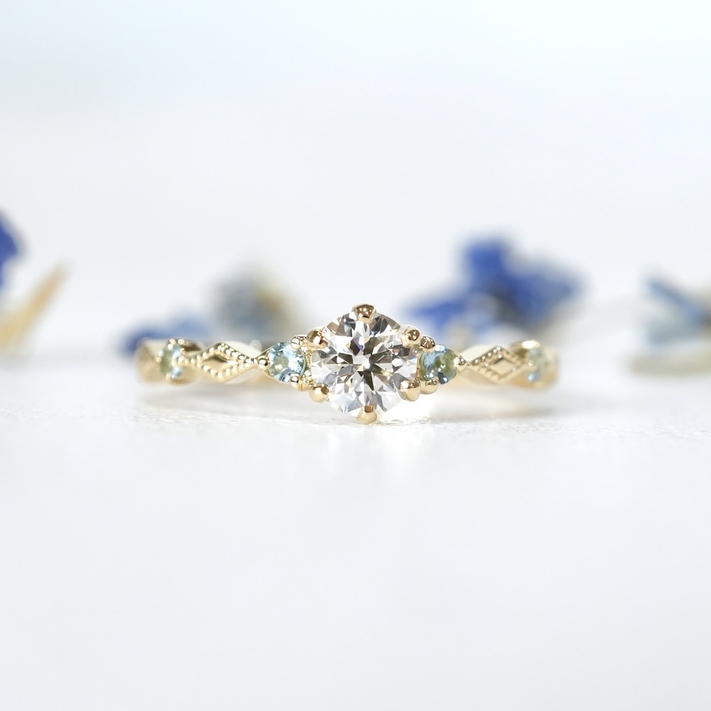#19EN-013 #アクアマリン #イエローゴールド #ストレート #ダイヤモンド #ミルグレイン #婚約指輪
