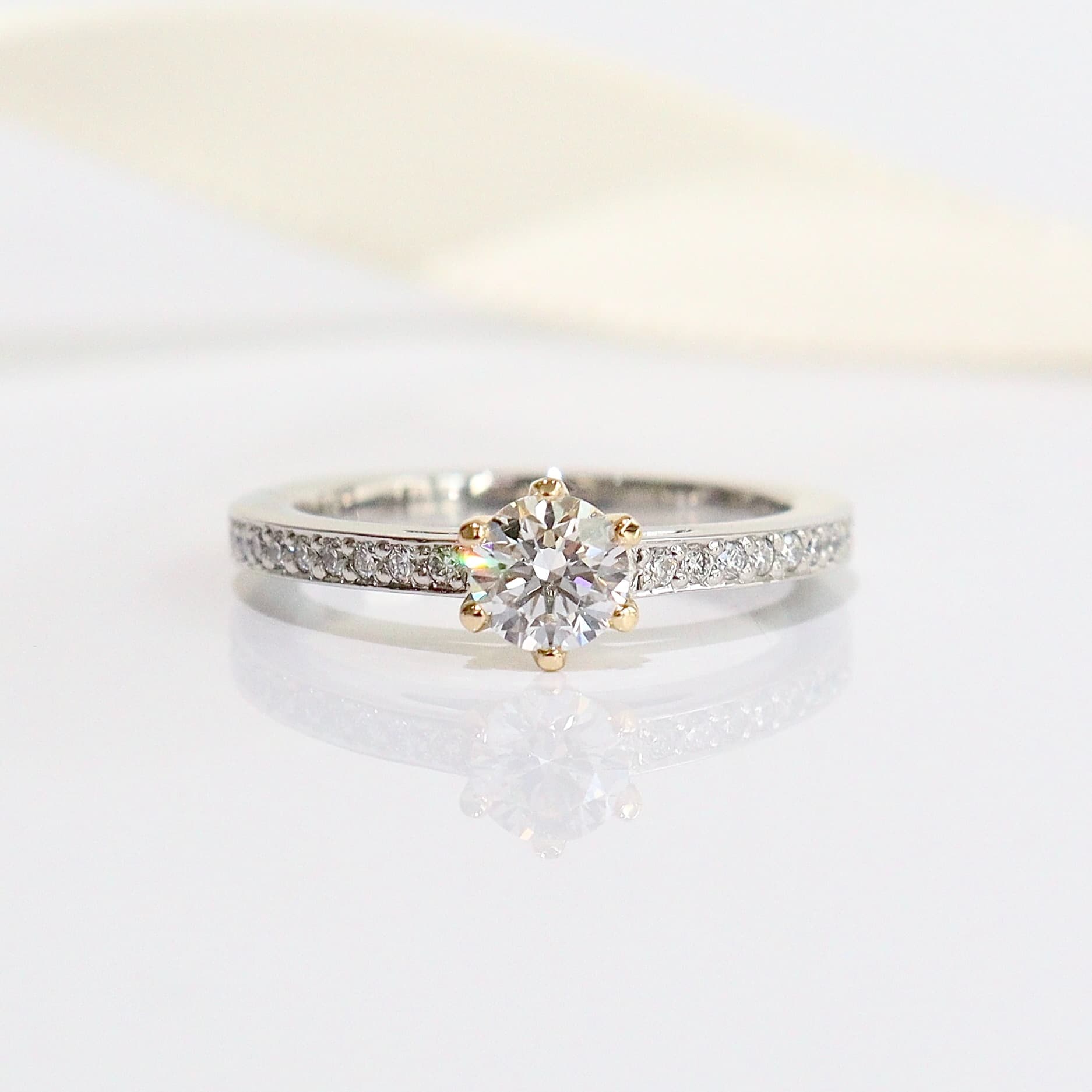 両サイドに連なるダイヤモンドがさりげない華やかさを添えてくれます。少し高さを出した石座によって婚約指輪の特別感を忘れさせません。