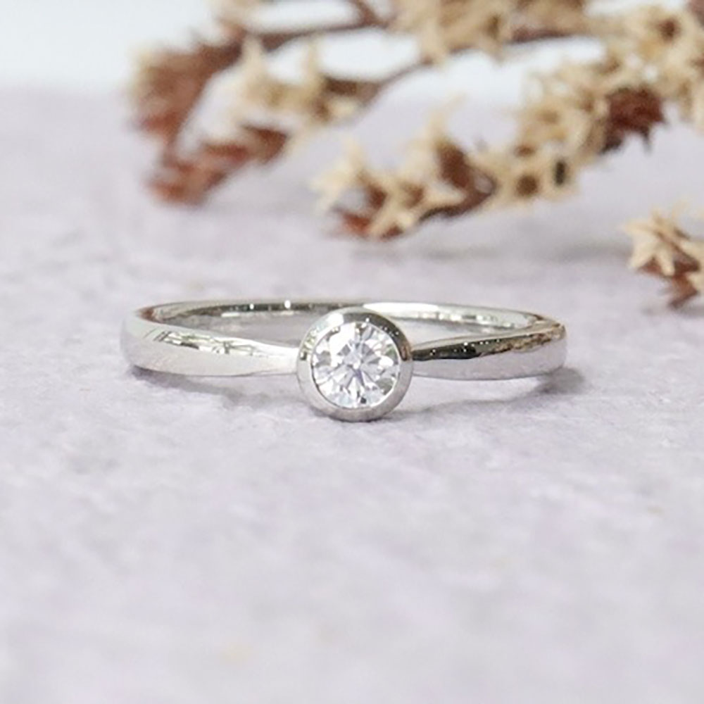 ダイヤモンドを包み込むように留めた覆輪留めの婚約指輪。ゴールドでお仕立てすることで地肌にも馴染みよく、引っかかりもないのでカジュアルにお使いいただけます。ダイヤモンドに向かってくびれるシャープなフォルムによって、華やかさも併せ持つデザインになりました。